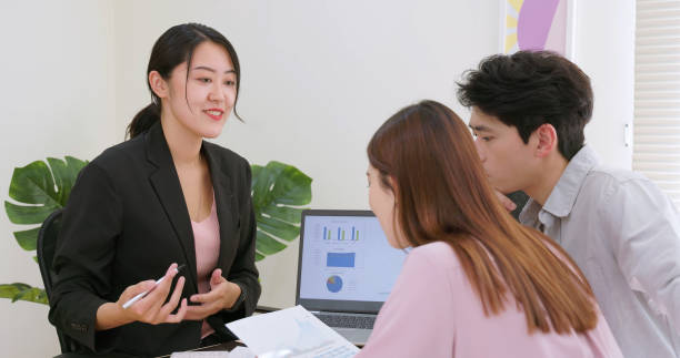 back view of asian young couple discuss with financial advisor for consultation in office